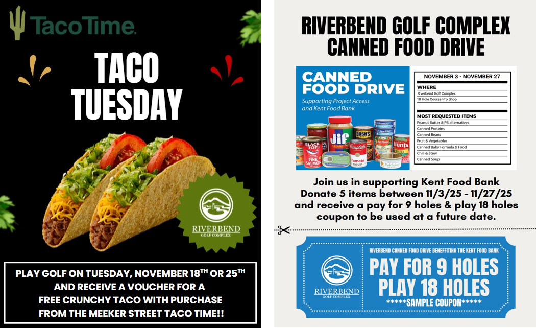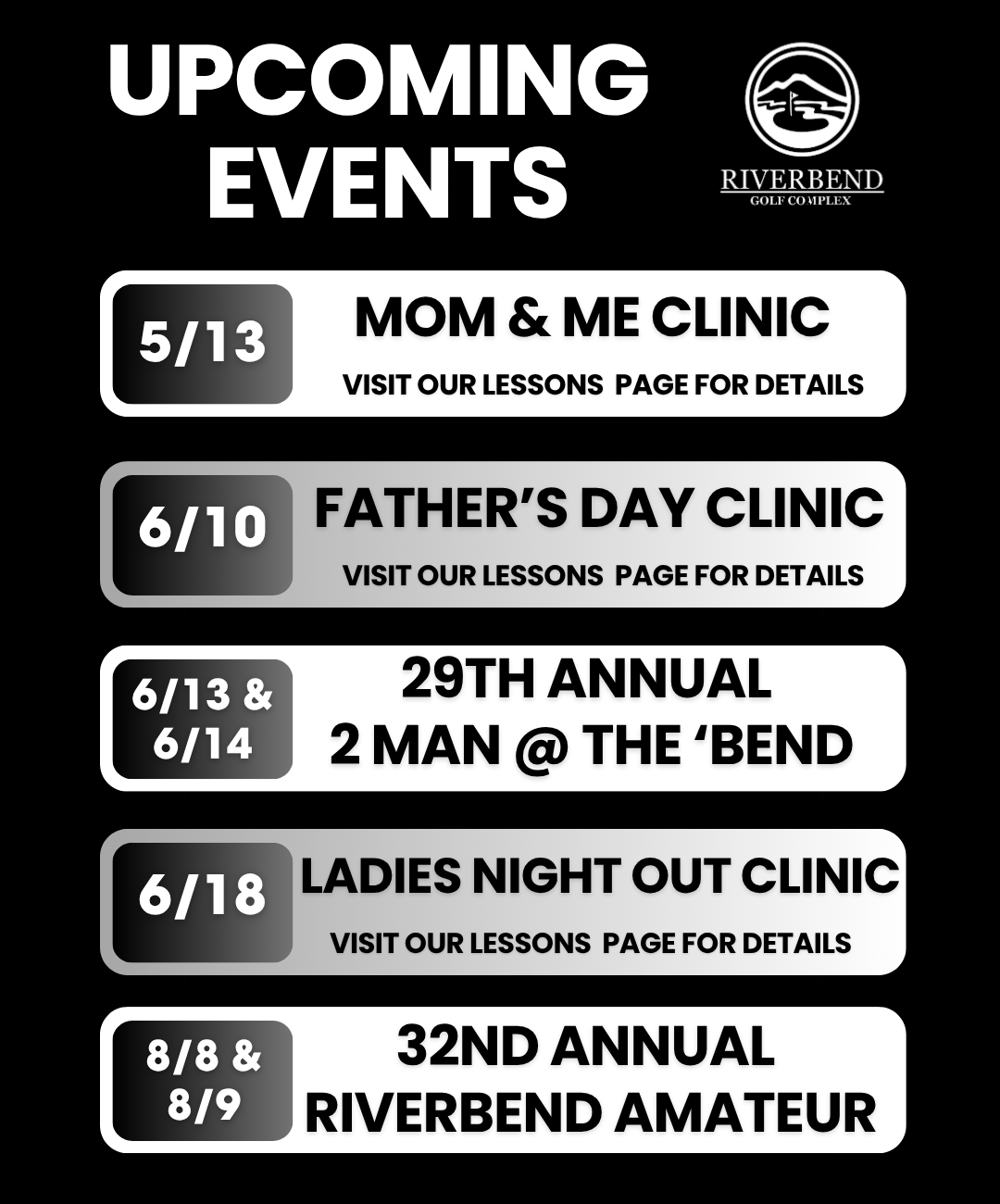 Riverbend Golf Complex is currently only accepting credit card payments. We are not accepting cash at this time. Thank you for your understanding.