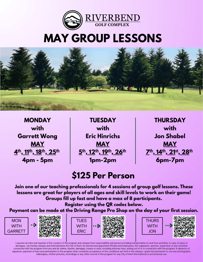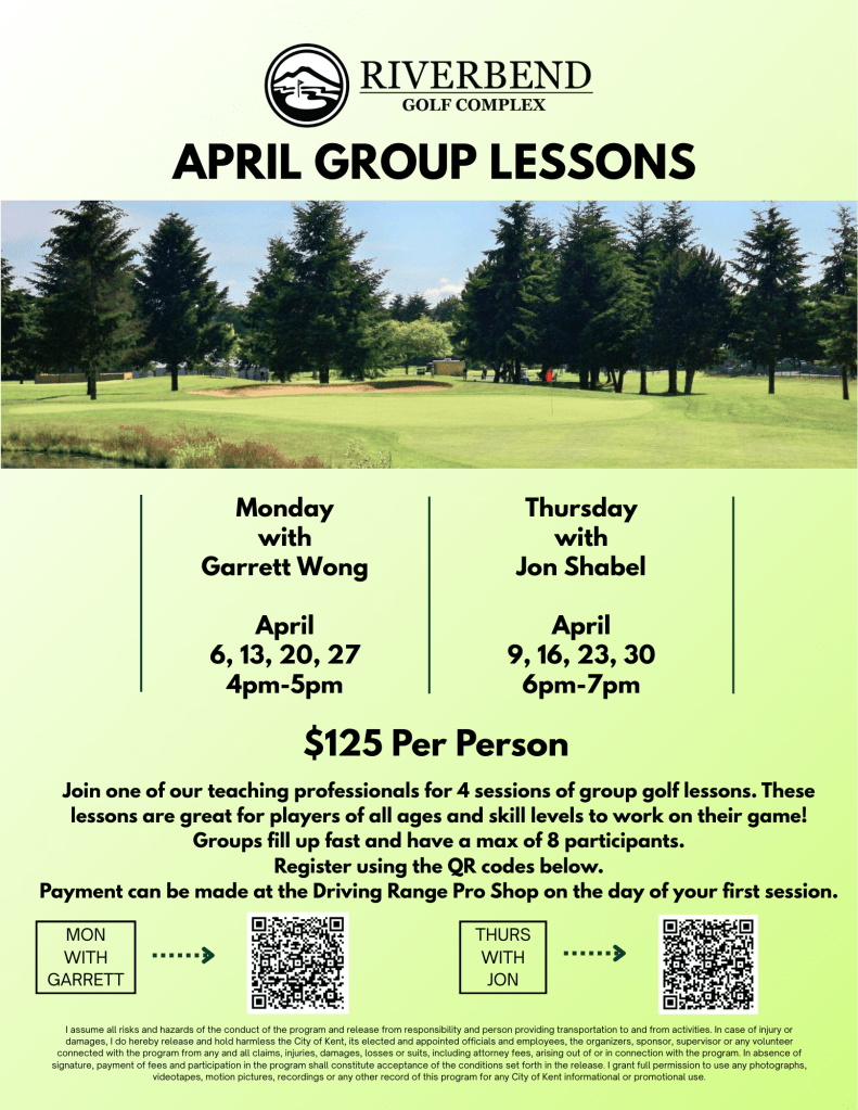 Riverbend is proud to offer group lessons at the beginning of each month. The group lessons include four hours of golf instruction, range balls, and clubs if necessary. Classes will meet once a week throughout the month at its designated time and day. Class sizes range from four to eight participants and is intended for the beginning golfer. If the posted times do not fit your schedule and you have a group of 5 or more people, will be happy to coordinate an alternate schedule for your own group. Group lesson topics cover setup, short and full swing fundamentals, swing myths, short game practice, and etiquette.